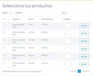 Cada producto cuenta con el botón “Agregar”, ubicado al lado izquierdo, que permite incorporarlo a una lista de cotización. El usuario puede repetir este proceso con todos los artículos que desea comparar, hasta completar su lista.