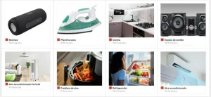 Al ingresar, el usuario encuentra un listado de categorías que incluye ventiladores, planchas de vapor, planchas secas, consolas y videojuegos, camas, tabletas, licuadoras, microondas, cocinas, freidoras de aire, refrigeradores, pantallas, bocinas, equipos de sonido, aire acondicionado portátil, aire acondicionado, laptops y lavadoras.